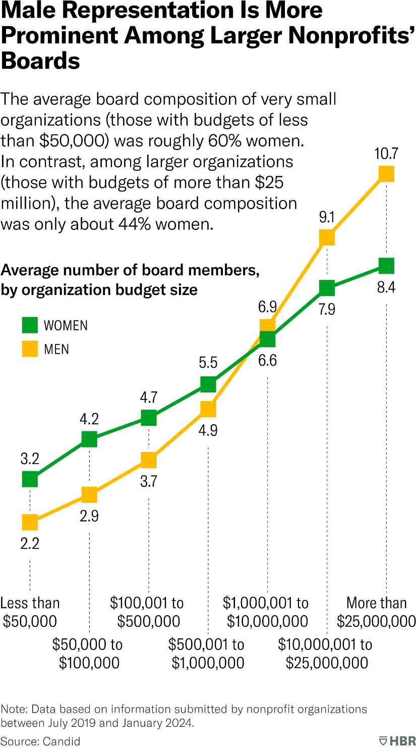 Male representation is also more prominent among larger nonprofits’ boards of governors, as shown in the following chart. The average board composition of very small organizations (those with budgets below $50k) was roughly 60% women. In contrast, among larger organizations (those with budgets above $25 million), the average board composition was roughly 56% men.